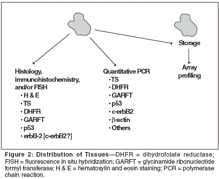 The emphasis of the biopsy tissueassessment was placed on messengerRNA (mRNA) expression of TS,DHFR, and GARFT with additionalstudies including quantitative polymerasechain reaction of p 53, andC-erb B2 as well as histology, immunohistochemistry,and/or fluorescencein situ hybridization (FISH) for TS,DHFR, GARFT, p53, and C-erb B2.For measurement of GARFT, a monoclonalantibody was specifically developedfor this study. Additionalmaterial was retained and stored forlater gene expression profiling. Frozenand paraffin-embedded specimenswere evaluated to ensure that theycontained sufficient tumor tissue forhistologic analysis. Ninety-four percentof frozen specimens and 88% ofparaffin-embedded specimens containedsufficient tumor tissue and wereevaluable for histologic analysis.(The tissue analyses are illustrated inFigure 2.)