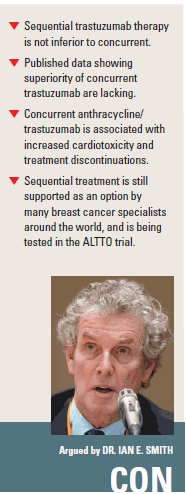 Dr. Smith argued that concurrent treatment is not better than sequential treatment. “I do not say that sequential is more effective, nor even that sequential is as effective, but there is no evidence that sequential delivery is less effective,” he said. “Since sequential treatment is also less cardiotoxic, it is still reasonable to give trastuzumab sequentially or concurrently.”