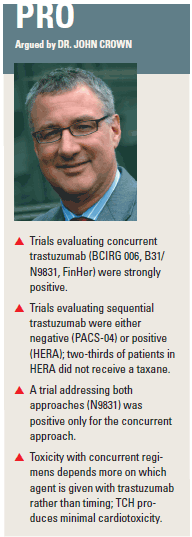 STOCKHOLM-Published data overwhelmingly support the use of trastuzumab (Herceptin) concurrently with chemotherapy, according to John Crown, MD, a consultant oncologist at St. Vincent’s Hospital in Dublin, Ireland. On the other hand, there is no evidence that sequential delivery is less effective than concurrent therapy, and it is definitely less toxic, commented Ian E. Smith, MD, head of the Breast Unit at Royal Marsden Hospital in London.