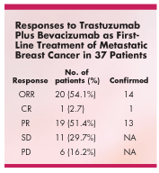 Interim efficacy data found an overall response rate of 54.1%, Dr. Pegram reported. Only 16.2% of patients progressed while on the combination (see Table).