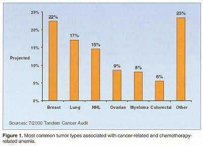 Tumor types more commonly associated with cancer-related and chemotherapy-related anemia and treated with human recombinant erythropoietin (rHuEPO) are breast cancer, lung cancer, non-Hodgkin’s lymphoma, ovarian cancer, myeloma, and colon cancer (see Figure 1). Synchronizing chemotherapy and erythropoietin treatments can help make anemia treatment much more convenient, Dr. Tchekmedyian noted.