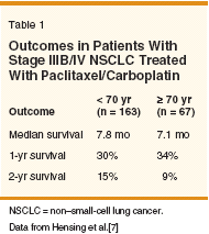 Hensing TA, Socinski MA, Schell MJ, etal: Age does not alter toxicity or survival forpatients with stage IIIB/IV NSCLC treated withcarboplatin and paclitaxel (abstract 1382). ProcAm Soc Clin Oncol 20:346a, 2001.