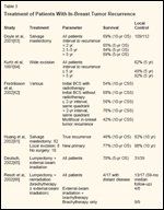 Surgery alone for in-breast tumor recurrence following surgery and radiotherapy was reported by Kurtz et al,[64] who treated 50 patients with salvage wide excision alone. The actuarial local control rate at 5 years was 62% and was influenced by the interval from primary treatment to tumor recurrence and margin status at the time of wide local excision. Fredriksson and colleagues[62] performed breast-conserving surgery for salvage of in-breast tumor recurrence in 45% of patients who had been treated initially with surgery alone. Of the patients initially treated with surgery plus radiotherapy, 26% had breast-conserving surgery for salvage. As in most studies of in-breast tumor recurrence, salvage treatment was individualized; therefore, treatment modalities cannot be compared directly.