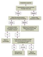 When seeing a patient with newly diagnosed systemic amyloidosis, the clinician must first establish that the amyloidosis is indeed of light chain origin. An algorithm for doing this is shown in Figure 1. The clinician must be certain that the patient does not have a localized form of amyloidosis, which is not treated with chemotherapy, and that the amyloid is of immunoglobulin light chain derivation, the only form that is responsive to systemic chemotherapy. Once this has been done, the decision needs to be made on the role of systemic chemotherapy for a given patient.