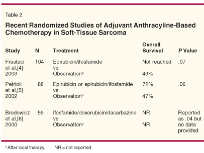 Over the past 25 years, extensive effort has also been directed toward determining whether anthracycline-based adjuvant chemotherapy offers a clinically meaningful benefit in patients with localized soft-tissue sarcoma. A summary of the second-generation randomized adjuvant chemotherapy trials is provided in Table 2.[4-6] These studies generally included more modern chemotherapy (agents, dose, and schedule) than were used in earlier-generation adjuvant chemotherapy trials performed in the 1970s and 1980s. None of the trials demonstrated any statistically significant impact of adjuvant chemotherapy on overall survival, but they were likely underpowered for this endpoint. The question of whether patients with high-risk (ie, American Joint Committee on Cancer stage III) tumors should be routinely offered adjuvant chemotherapy remains an open issue about which there has been considerable discussion and debate.