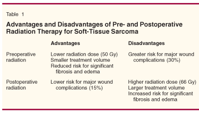 Considerable attention has been focused on the optimal sequence of surgery and radiation. This is because both pre- and postoperative radiation offer specific advantages but are associated with specific risks (Table 1). Preoperative radiation generally is administered using a lower total dose (50 Gy) and smaller treatment volume than postoperative radiation (65 Gy). These differences are clinically significant since the lower dose and smaller treatment volume used with preoperative radiation result in lower risks for serious late treatment-related adverse effects including edema and fibrosis. However, the risks for short-term side effects-particularly radiation-related impairment in wound healing leading to major wound complications-is higher with preoperative radiation than postoperative radiation. Because the local control rates with these two approaches appear similar, assessment of the risks for these clinically significant short- and long-term side effects assumes considerable importance in individual patient treatment planning.