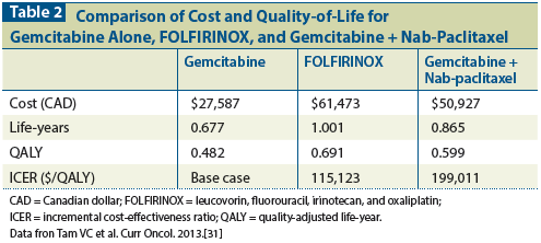 Table 2: Comparison of Cost and Quality-of-Life for Gemcitabine Alone, FOLFIRINOX, and Gemcitabine + Nab-Paclitaxel