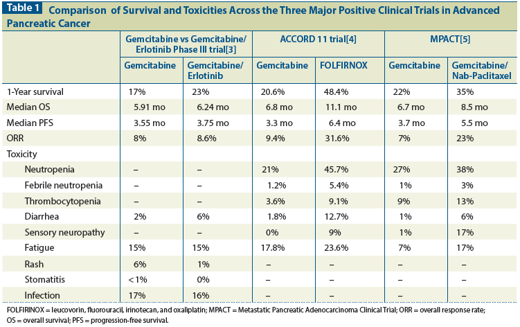 Table 1: Comparison of Survival and Toxicities Across the Three Major Positive Clinical Trials in Advanced Pancreatic Cancer