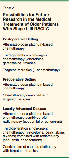 Future investigations in the medical treatment of older patients with stage I-III NSCLC (Table 2) will include the evaluation of alternative schedules of chemotherapy and chemoradiotherapy more suitable for the elderly and the introduction of new, well-tolerated targeted therapies.