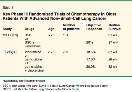 The main clinical data on chemotherapy for elderly NSCLC patients come from cases of advanced disease. These data are useful for administering chemotherapy and designing clinical trials in patients with early-stage disease as well. A phase III multicenter trial in 191 patients (the Elderly Lung Cancer Vinorelbine Italian Study, or ELVIS) showed that single-agent vinorelbine improved quality of life and survival compared to supportive care alone (median survival: 27 vs 21 weeks, P = .04).[29] Therefore, in elderly patients with advanced NSCLC, palliative chemotherapy should be considered.