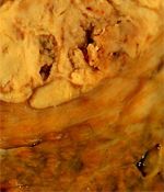 The closer view on this picture (click to enlarge), shows tumor at the top, cirrhotic liver at the bottom, and a fibrous reaction in between. Hepatocellular carcinomas can have a variety of gross patterns, including multinodular/multifocal, such as this one.