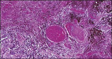 Photomicrograph of metastatic malignant melanoma in the human lymph node, section, H&E stain, magnified 10× at 24 × 36 mm.