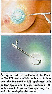MammoSite RTS, developed by Proxima Therapeutics, Inc., is an intracavitary balloon device designed to provide accelerated site-specific radiation therapy in patients with early-stage breast cancer treated by lumpectomy, the company said in a news release. MammoSite therapy is simpler to deliver than brachyther-apy, the company said, and may avoid the side effects associated with external beam radiation therapy.