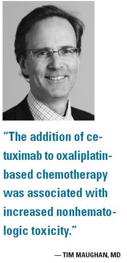 “The addition of cetuximab to oxaliplatin-based chemotherapy was associated with increased nonhematological toxicity and no change in OS or PFS for all patients and for KRAS wild-type patients as well in this study,” Dr. Maughan said. Overall survival in patients with KRAS mutations was 14.8 months with chemotherapy alone and 13.6 months with the addition of cetuximab. Two-year survival was 21.9% and 28.2%, respectively, in the mutated subgroup. None of the differences in endpoints were statistically significant.
