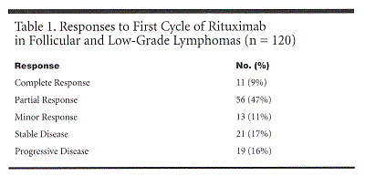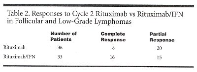 Complete response occurred in 8/36 rituximab patients vs 16/33 rituximab/IFN patients. (See Table 2.) Partial responses occurred in 20 rituximab patients vs 15 rituximab/IFN patients.