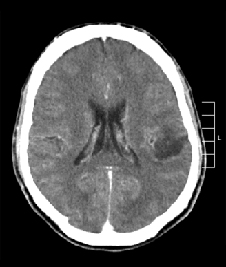 Glioma of the left parietal lobe, CT scan with contrast enhancement; source: Ninilak, Wikimedia Commons