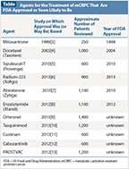 Derleth and Yu have summarized the progress made in treating metastatic castration-resistant prostate cancer (mCRPC).[1] Since the US Food and Drug Administration (FDA) approval of mitoxantrone and docetaxel (Taxotere) in 1999 and 2003, respectively, the agency has approved two other non–androgen receptor (AR)-targeting agents, sipuleucel-T (Provenge) and radium-223 (Xofigo) (although docetaxel may target the AR via the tubulin transport of the AR complex[2]) and two AR-targeting agents, abiraterone (Zytiga) and enzalutamide (Xtandi). In the next several years, the FDA will potentially receive applications to approve orteronel, an AR-targeting agent, as well as tasquinimod and custirsen, both non–AR-targeted agents. Meanwhile, the dual MET/vascular endothelial growth factor (VEGF) inhibitor cabozantinib and the immunotherapeutic agent PROSTVAC are in phase III trials. If the results of these phase III trials are all positive, there could be 11 FDA-approved agents for the treatment of mCRPC within 5 years (Table).
