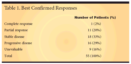 Treatment was administered asUFT (300 mg/m2) plus leucovorin (30mg) every 8 hours for 28 days, with 7days of rest. CT scans were performedevery 2 weeks.Similar Results toSingle-Agent 5-FUAccording to updated data presentedby Elizabeta C. Popa, MD, of NewYork University Cancer Institute, thebest confirmed responses among the55 treated patients were a completeresponse in 1 patient and a partialresponse in 11 patients. Eighteen patientshad stable disease and 16 hadprogressive disease. Nine patients werenot evaluable (Table 1).Results are similar to the 22% responserate and 13-month median survivalreported for single-agent 5-FU."Phase III studies comparing bolus IV5-FU and oral UFT/leucovorin haveshown similar response rates and survivaloutcomes to our study," Dr. Popaadded.The investigators said that additionalstudies comparing infusional 5-FU with oral UFT/leucovorin, as wellas phase II studies using UFT/leucovorinin combination with newer agents,such as oxaliplatin (Eloxatin), irinotecan(Camptosar), and biologics, "arewarranted to establish maximal utilityof this oral fluoropyrimidine."