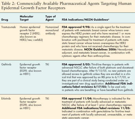 Gefitinib (Iressa), which the FDA approved in 2003 for the treatment of metastatic non-small-cell lung cancer (NSCLC), targets HER1 (Table 2). Gefitinib, the first commercially available EGFR-inhibiting agent, is an oral small-molecule TKI with activity in the intracellular domain.[24]