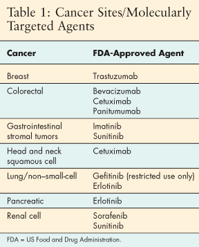 The FDA has approved nine molecularly targeted agents during the past decade for treatment of cancer patients with solid tumors. Standard clinical practice now includes use of targeted agents with at least seven types of solid tumors (Table 1). Clinical trials continue to investigate these drugs, and additional agents will be added to the cancer treatment armamentarium in the near future.
