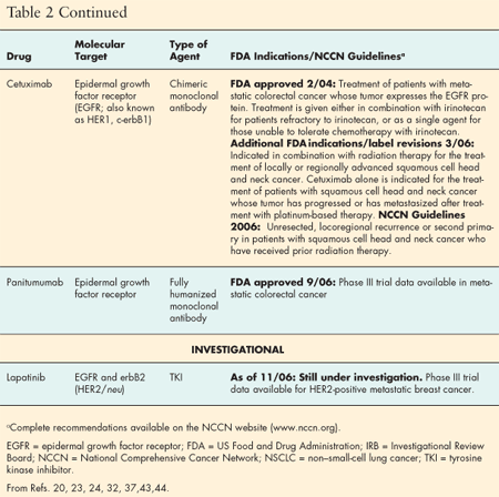 The FDA approved the EGFR-inhibiting agent cetuximab (Erbitux) in 2004 for use in metastatic colorectal cancer (Table 2). Cetuximab is a recombinant chimeric MoAb that binds to EGFR in the extracellular domain.[37] Its approval was based on early clinical data response rates in an open-label, randomized study that compared monotherapy cetuximab with cetuximab and irinotecan in patients who were diagnosed with EGFR-expressing colorectal cancer and were refractory to irinotecan. The tumor response rate of 22.9% to cetuximab in combination with irinotecan in patients with irinotecan-refractory disease was clinically important. The median time to progression and survival time were similar to that of patients who had received standard treatment.[38]