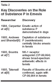 Substance P is an 11-amino-acid regulatory peptide, one of three tachykinins identified to date (the others are neurokinin A and neurokinin B). The tachykinins bind to various neurokinin (NK) receptors, of which at least three subtypes have been isolated: NK-1, NK-2, and NK-3/3B. Substance P is the preferred ligand for NK-1 receptors, which are found in substantial numbers in key areas of the emetic reflex arc, such as the gastrointestinal tract, the area postrema, and the nucleus tractus solitarius. Substance P excites cholinergic neurons, causes vasodilatation, stimulates salivatory secretion, and contracts smooth muscle. While this clearly has implications for emesis, it also has potential implications for other pathologic processes, such as depression, asthma, bladder irritability, inflammatory bowel disease, and other functionalgastrointestinal diseases.[4] The initial recognition that substance P might have a role in emesis dates back 20 years (Table 2) to when Carpenter and colleagues showed that giving substance P to dogs could evoke emesis.[5] About a decade later, Andrews and Bhandari suggested that resinferatoxin may exert its potent antiemetic effect by depleting substance P at a central site in the emetic reflex arc in the ferret.[6] At about the same time, a number of scientists succeeded in developing selective NK-1 receptor antagonists and demonstrated that they exert broad antiemetic effects in the ferret.[7,8] Together these early studies strongly suggested that substance P may have relevance to emesis in humans.