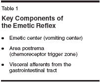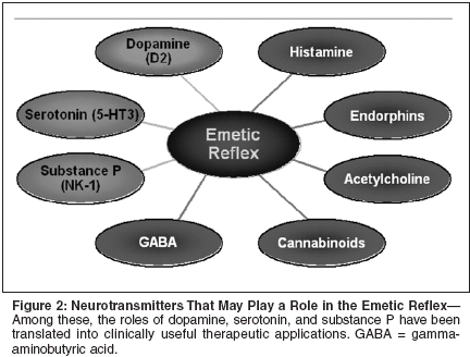 The emetic reflex has three key components, as outlined in Table 1 and illustrated in Figure 1. The first component is the emetic center, which was discussed above. The second component is the area postrema, located inthe medulla in the floor of the fourth ventricle. It is accessible both to the cerebrospinal fluid and, since it is outside the blood-brain barrier, to bloodborne toxins. Its alternate name-the chemoreceptor trigger zone-stems from its potential to be impacted by materials in either the cerebrospinal fluid or the blood. The third component of the emetic reflex is the visceral afferent nerve fibers that come from the small intestine. These vagal and splanchnic afferents project either directly up to the emetic center or indirectly via the area postrema. Insights into the anatomic location of these key components of the emetic reflex arc have been accompanied by an increasing recognition of the role played by a multitude of neuroactive substances (Figure 2) and their receptors in these processes. Initial attention focused on dopamine, given the modest to moderate clinical efficacy of antidopaminergic agents on CINV and the recognition that apomorphine, a dopamine type 2 (D2) receptor agonist, can evoke emesis bybinding to D2 receptors in the area postrema.