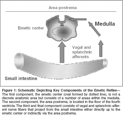 The emetic reflex has evolved over the eons and across many different species. It most likely evolved as a defensive mechanism that provides organisms with a means to expel potentially toxic ingested substances. Because emesis has developed over so long a time, it likely will be very difficult to extinguish, given the considerable redundancy in the reflex pathways involved in the emetic process. Our current understanding of the structures and neural circuitry involved in the emetic reflex has evolved from the pioneering studies of Borison and Wang in the 1940s and 1950s.[1] They first introduced the concept ofan "emetic center" or "vomiting center" in the brainstem that receives afferent input from a host of sites, such as the gastrointestinal tract, intracranial pressure receptors in the brain, the cortical system, the vestibular labyrinths, and the "chemoreceptor trigger zone" (area postrema). The emetic center is not an anatomically distinct area but rather a variety of areas that work collectively to serve as the final common pathway to activate the salivatory center, the vasomotor center, the respiratory center, and the cranial nerves. Together these areas provide the final efferent output to the abdominal muscles, the diaphragm, the stomach, and the esophagus that results in the emetic reflex itself.[1,2]