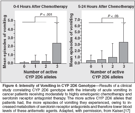 Kaiser and colleagues tested this hypothesis in a clinical trial that correlated CYP 2D6 genotype with the intensity of acute CINV in 270 cancer patients receiving moderately to highly emetogenic chemotherapy; patients received antiemetic therapy with the serotonin receptor antagonists ondansetron (Zofran) or tropisetron.[17] They found a direct correlation between the number of active CYP 2D6 alleles that patients had and the number of vomiting episodes they experienced (Figure 4). Patients with no active alleles do not metabolize serotonin receptor antagonists and therefore have high blood levels of these antiemetic drugs; as expected, these patients had less emesis than did patients with more active alleles. Likewise, some patients had three active wild-type alleles, and these patients had the most vomiting episodes, as would be expected from the fact that they metabolize serotonin receptor antagonists most efficiently and thus have lower blood levels of the drugs. These findings applied both during the first 4 hours after chemotherapy and for hours 5 to 24 following chemotherapy.