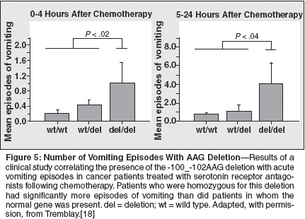 The same research team has also explored the hypothesis that polymorphisms in the 3B subunit of the5-HT3 receptor may result in differential effects of serotonin receptor antagonists in patients with CINV.[18] They sequenced the 5-HT3B receptor gene among 232 cancer patients treated with ondansetron or tropisetron within the first 24 hours of chemotherapy. Of the 13 polymorphisms identified, one-a deletion of three amino acids (AAG)-appeared to have relevance to antiemetic outcomes. As shown in Figure 5, patients who were homozygous for the deletion of this gene had significantly more episodesof vomiting both acutely and 5 to 24 hours after chemotherapy when compared with patients who had the normal gene present. Although the patients with this polymorphism were a small subgroup of the total sample (1% to 2%), this study nevertheless supports the principle that pharmacogenomics potentially can be used to identify groups that may be at higher risk and who may not respond to conventional therapies.
