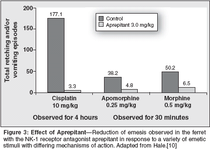 These findings were confirmed in a study by Hale and colleagues using another NK-1 receptor antagonist, MK-869, which is now known as the drug aprepitant (Emend), in ferrets that were given either cisplatin, apomorphine, or morphine as the emetic stimulus.[10] As shown in Figure 3, there was again a marked reduction in retching and vomiting episodes when the animals were pretreated with the NK-1 receptor antagonist. Again, all three of the emetic stimuli used act by different mechanisms.
