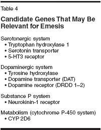 Pharmacogenomics, the study of the relationship between specific DNA sequence variations and the actual effect of a drug, may offer a means tofurther extend and improve our understanding of CINV. As the proportion of patients failing all available antiemetic treatment options continues to diminish, it will be critically important to better characterize which factors differentiate these patients from those with well-controlled emesis. Molecular profiling of malignant tumors and patients' capacities to metabolize drugs has become an increasingly prominent area in oncology in recent years. The same principles could be applied to supportive cancer management as well. There are a number of candidate genes that might have relevance for emesis. As detailed in Table 4, they may be within the serotonergic system, the dopaminergic system, the substance P system, or the cytochrome P-450 (CYP 450) system for drug metabolism. Kaiser and colleagues in Germany have pioneered the application of pharmacogenomics to CINV, and their work has focused primarily on two areas: variations in the metabolism of the serotonin receptor antagonists by CYP 450 genotype, and variations in the 5-HT3 receptor gene itself.