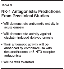 These preclinical studies are important because of the predictions they generated about the likely clinical actions of selective NK-1 receptor antagonists (Table 3),[14-16] which have since largely been borne out in clinical trials (as is discussed in the article by Dr. Grunberg in this supplement). Analyses of several of these trials suggest that serotonin-dependent mechanisms may be most important early in the emetic period, whereas substance P-dependent mechanisms may be more important later, providing a compelling rationale for combination antiemetic therapy.[16]