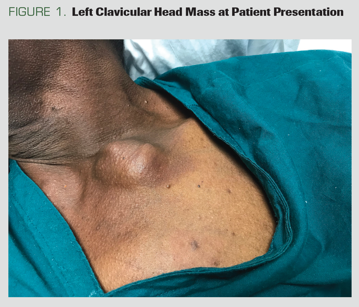A man, aged 70 years, with untreated HCV infection, alcohol use disorder, and tobacco dependence, presented with a 5 x 4 - cm left clavicular head mass of unknown duration (Figure 1). He also endorsed 6 months of decreasing appetite and weight loss. He denied any pain from the mass, cough, hemoptysis, hematochezia, melena, hematuria, urinary hesitancy, abdominal or back pain, nausea/vomiting, or skin changes. Organomegaly and palpable masses apart from the clavicular head mass were absent.