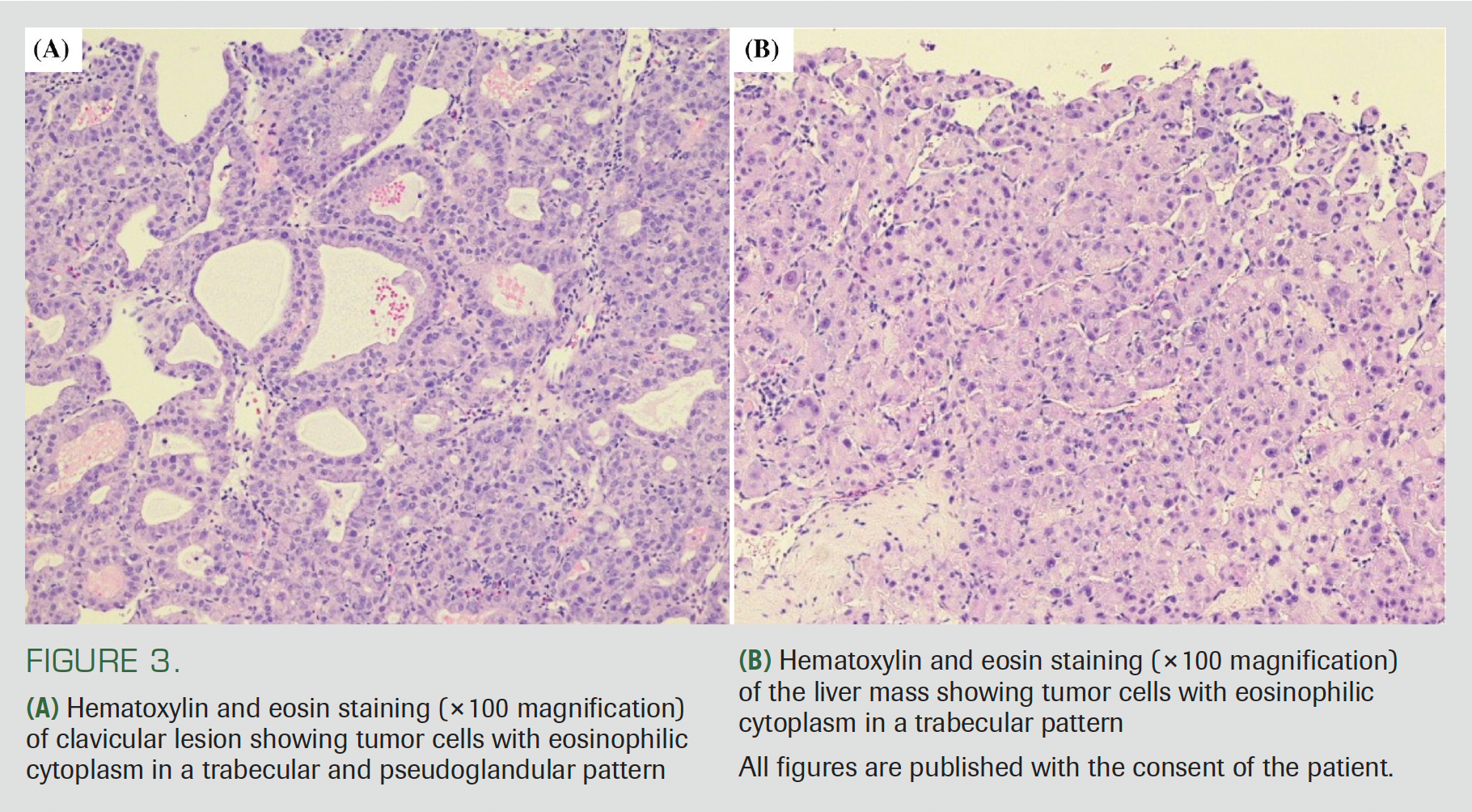 Hepatocellular carcinoma (HCC) is among the most common cancers worldwide, with incidence steadily increasing in the United States.1 The vast majority of HCC cases develop in the setting of liver cirrhosis and are diagnosed based on clinical evaluation, risk factor assessment, and imaging.1 Liver biopsy may be performed to confirm a diagnosis or evaluate suspicious lesions in atypical presentations.1 Prognosis of HCC is generally poor, with a median survival of 9 months from diagnosis.2 Extrahepatic spread frequently occurs, but it is present in only 5% to 15% of cases at diagnosis.2 Although the lungs are the most common site, metastasis also occurs to the bone—most frequently the vertebra—although this is rare at diagnosis and associated with significant morbidity and mortality.3 Here, we present a patient with a large clavicular head mass who was found to have HCC with spinal metastases in the setting of chronic hepatitis C virus (HCV) infection without clinical evidence of cirrhosis, an unusual presentation not previously described in literature.