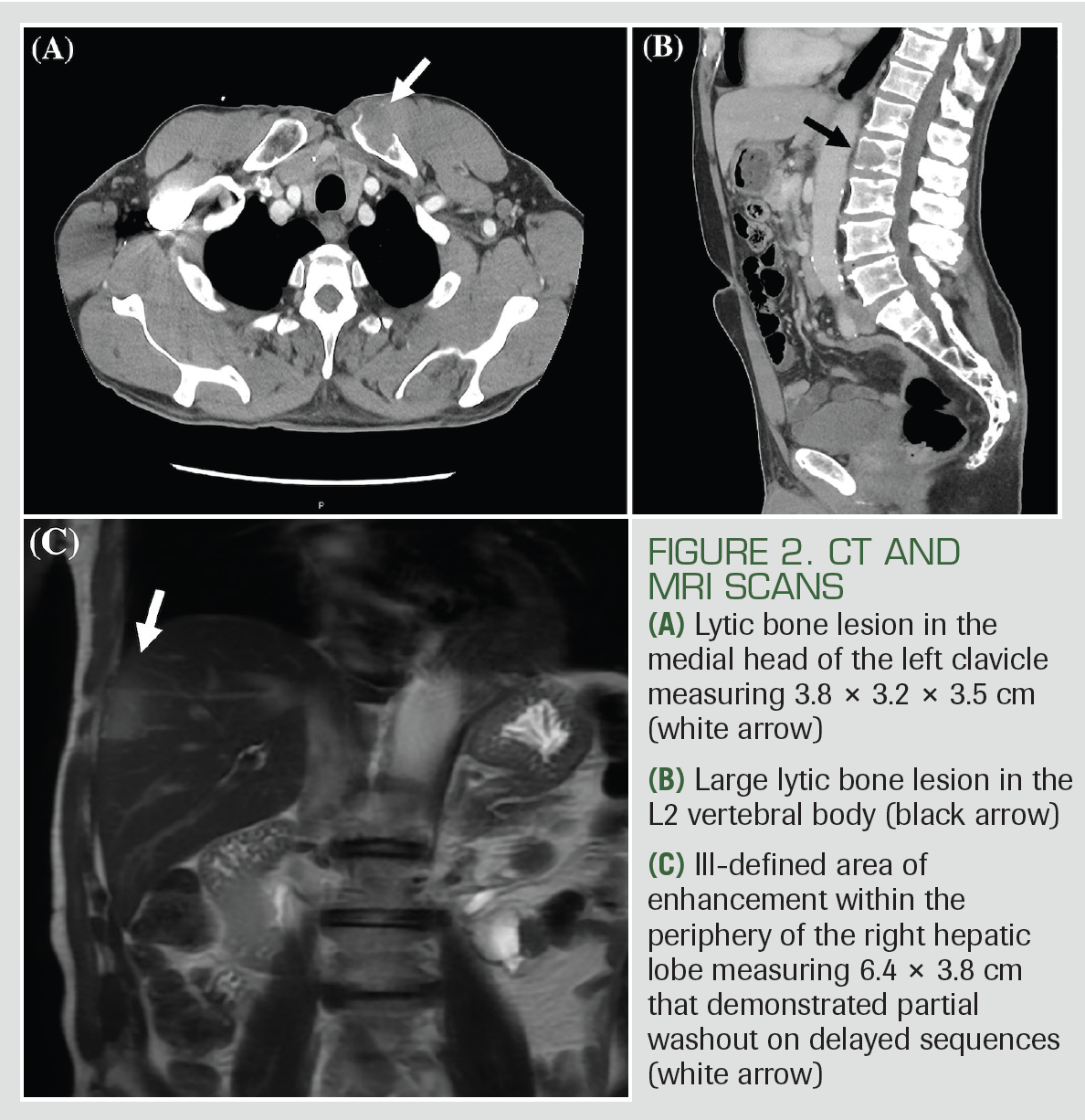 A thoracic CT scan revealed a soft tissue clavicular mass and multiple lytic vertebral lesions (Figures 2A and 2B). A CT scan of the abdomen/pelvis identified 2 poorly defined hepatic masses. Liver mass protocol MRI showed an ill-defined area of enhancement within the periphery of the right hepatic lobe that demonstrated partial washout on the portal venous phase, and the liver surface was not suggestive of cirrhosis and did not have evidence of portal hypertension (Figure 2C). Admission laboratory studies showed that aspartate aminotransferase, alanine aminotransferase, alkaline phosphatase, total bilirubin, serum albumin, prothrombin time, international normalized ratio, and platelets were within normal limits. HCV viral load was 10,400,000 IU/mL, and HIV and hepatitis B virus (HBV) core antibody/surface antigens were negative. α-fetoprotein (AFP), cancer antigen (CA)-19-9, CA-125, carcinoembryonic antigen, and prostate-specific antigen levels were within normal limits.