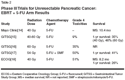 Anonymous: Treatment of locallyunresectable carcinoma of the pancreas: Comparisonof combined-modality therapy (chemotherapyplus radiotherapy) to chemotherapyalone. Gastrointestinal Tumor Study Group.J Natl Cancer Inst 80:751-755, 1988.