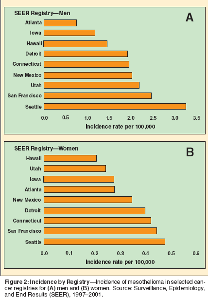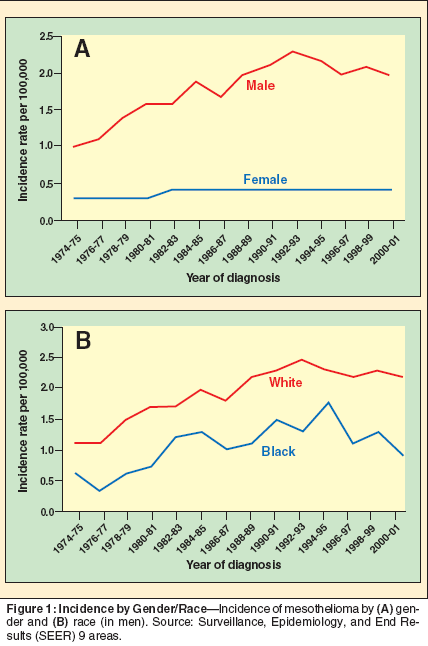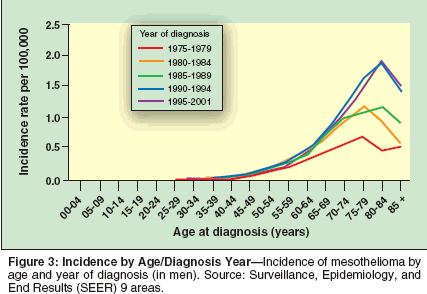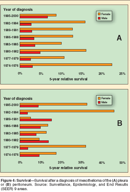 Asbestos, a silicate mineral of magnesium, calcium, and iron, occurs as fibrous rock, which is mined and milled. Asbestos fibers are either needle-like (amphiboles including amosite, tremolite and crocidolite) or spiral (chrysotile). Risk of mesothelioma varies by asbestos type broadly in the ratio of 1:100:500 for chrysotile, amosite, and crocidolite, respectively.[ 11] Although chrysotile is associated with the lowest risk, it nevertheless appears to result in some risk in animals and humans.[12] The word "asbestos" is derived from a Greek root for inextinguishable or indestructible. Asbestos use is documented for more than 6,000 years. Persians burned bodies in asbestos cloth to preserve the ashes. Pliny the Elder observed that the asbestos quarry slaves died young and thus recommended they not be purchased. Modern recognition of the health effects of asbestos exposure were initially complicated by the high incidence of tuberculosis in sweatshops in Europe. In 1930, however, Merewether convincingly demonstrated pulmonary fibrosis in asbestos workers, coining the term "asbestosis." In 1955, Doll recognized lung cancer arising in asbestos workers,[13] and in 1960, Wagner et al described 47 cases of mesothelioma in South Africa in a crocidolite (blue amphibole asbestos) mining community, and established the diagnosis (which until then had been debated) as well as both occupational and bystander risk.[14] Asbestos fibers in lung tissue are found as either uncoated fibers or ferruginous bodies, fibers coated by macrophages with iron substance. Because fibers persist once in situ, exposure continues decades after fibers were initially inhaled. Pleural calcified plaques may develop decades after a significant asbestos exposure. Asbestos is not carcinogenic in the Ames test; however, it induces reactive oxygen species and damages DNA, producing chronic inflammation and eventual fibrosis. Because of the pattern of asbestos use, mesothelioma incidence will likely peak in Europe[15,16] in about 2020. Surveillance, Epidemiology, and End Results (SEER) data in the United States show that the incidence peaked in 1994-1995 at 1.2 cases per 100,000, with a small nonsignificant decline to 1.0 cases per 100,000 in 2000-2002.[1] The incidence varies considerably by location, being highest along coastal towns associated with shipyards and in states with industrial asbestos textile mills (Figure 2). At- risk occupations include asbestos miners and millers, but also insulation, shipyard, and maintenance workers,[ 17] as well as auto mechanics.[18] Workers manufacturing cigarette filters were exposed due to asbestos in the filter paper.[19] Incidence is lower for African-Americans than for European- Americans (Figure 1) because of work place patterns favoring whites for employment. Few women were employed in these industry jobs at the time.[1] Presentation About 85% of mesotheliomas arise in the pleura, about 9% in the peritoneum, and a small percentage in the pericardium or tunica vaginalis testis.[1] Peritoneal mesotheliomas may develop more frequently in men with heavier asbestos exposure. Women comprise only about 18% of patients with pleural mesothelioma, but 42% of those with peritoneal mesothelioma. Risk is highest at about age 80 to 84 (Figure 3).[1] The median age in reported clinical trials is frequently a decade or more younger than the median age of patients in the SEER database. Patients with pleural mesothelioma initially complain of shortness of breath or chest pain, whereas those with peritoneal mesothelioma present with increased abdominal girth or abdominal pain.[20,21] Fine-needle biopsy can be used to document recurrence or metastases but is not sufficiently reliable for primary diagnosis.[22] The histology of about half of mesotheliomas is epithelial (tubular papillary), with the remainder being sarcomatous, or mixed.[20,21] Multicystic mesotheliomas and welldifferentiated papillary mesotheliomas are associated with a long survival in the absence of treatment. Thus, these patients should be excluded from clinical trials intended for the usual rapidly lethal histologic variants of mesothelioma.[23-25] Prognostic Variables and Survival The median survival in the Surveillance, Epidemiology, and End Results (SEER) database is approxi mately 7 months and has not improved over the past 2 decades, for either pleural or peritoneal mesotheliomas (Figure 4).[1]