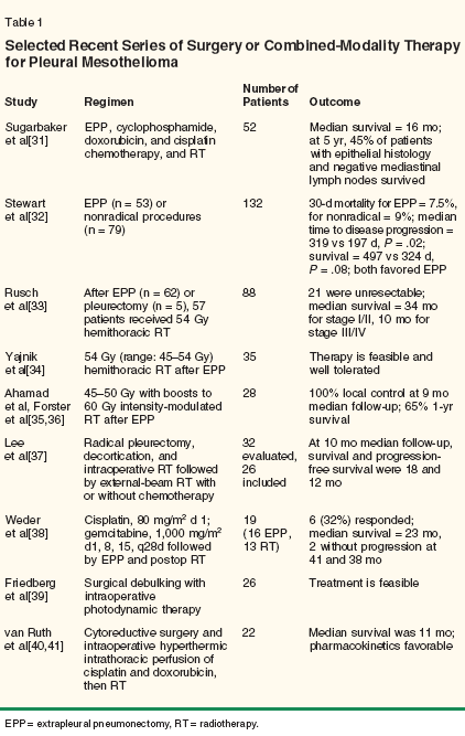 33. Rusch VW, Rosenzweig K, Venkatraman E, et al: A phase II trial of surgical resection and adjuvant high-dose hemithoracic radiation for malignant pleural mesothelioma. J Thorac Cardiovasc Surg 122:788-795, 2001.