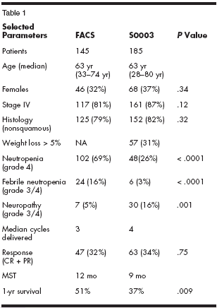 days 1, 2, 3, IVq3wk, * 5.The primary end point was incidence of FN in firstcycle. Targeted accrual was N = 156 patients (78/arm).See Table 1 for results. A total of 171 patients wereeligible. Patient characteristics were well balanced.