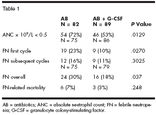 CONCLUSION: The addition of primary prophylacticG-CSF to prophylactic antibiotics significantlyreduced the incidence of chemotherapy-related FN inSCLC patients at increased risk of FN, especially in thefirst cycle by 50%.