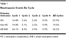 CONCLUSION: Neutropenic complications andsevere neutropenic events occur early in the course oftherapy, potentially compromising chemotherapy doseintensity and clinical outcomes. Significant independentrisk factors include cancer type, regimen, doseintensity, gender, stage, and several comorbidities.