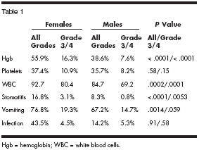 Myelosuppression represents the major dose-limitingtoxicity of cancer chemotherapy. A prospective,nationwide study was undertaken to define risk factorsfor neutropenic complications (NC) and to developrisk models for selecting patients for hematopoieticsupport. More than 2,500 patients have been prospectivelyregistered at 137 randomly selected practicesites.Primary outcomes included documented severeneutropenia (SN) (ANC < 500), NC (fever/infection/other), and severe neutropenic events (SNE) (SN orNC). This preliminary analysis is based on the first2,222 patients treated to date including 886 (40%)age ≥ 65. One-third did not receive at least four cyclesof chemotherapy due to disease progression (55%),refusal (11%), death (11%), and unknown (23%).Neutropenia (ANC < 1,000) was documented in40%, including SN in 26%. More than one-half of allinitial events occurred during cycle 1.In addition to cancer and regimen type, significantpredictors of SN included gender (.001), baselineneutrophils (.01), diabetes (.037), and chronic lungdisease (.001). Significant predictors of NC includedgender (.004) and stage (.04). In addition to cancerand regimen type, significant predictors of SNE includedgender (.006), stage (.007), and chronic obstructivepulmonary disease (.029). The risk of SNEin all cycles (first cycle) includes breast 49 (36), lung31 (20), lymphoma 42 (33), ovary 37 (17), and colon18 (8). See Table 1 for summary.