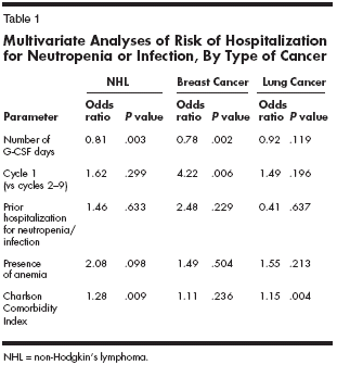 CONCLUSION: Among patients with NHL, BC,and LC receiving G-CSF prophylaxis, longer coursesof therapy confer lower risks of hospitalization.Commentary on Abstracts #A-50and #A-59