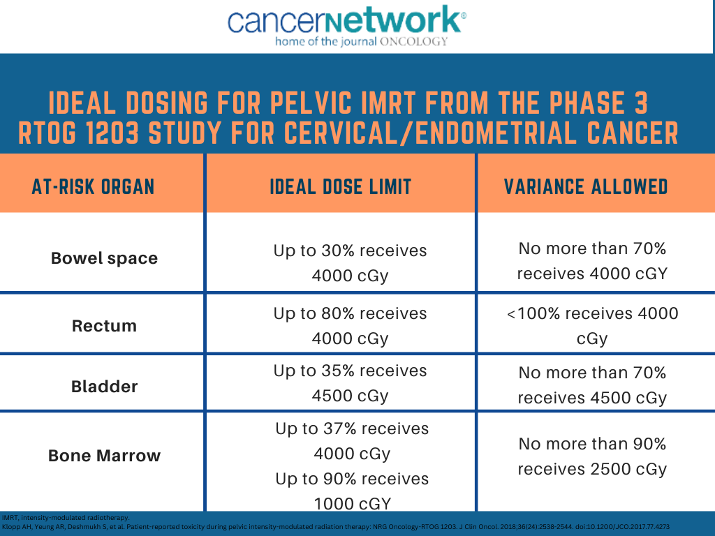 Ideal dosing for pelvic IMRT from the phase 3 RTOG 1203 study for cervical/endometrial cancer.