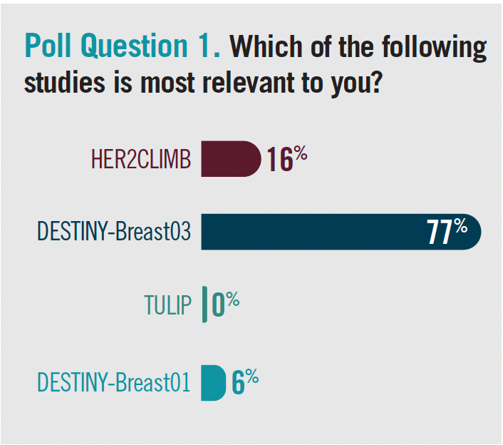 In a polling question, audience members indicated that the DESTINY-Breast03 trial was the most relevant to their practice (poll question 1).