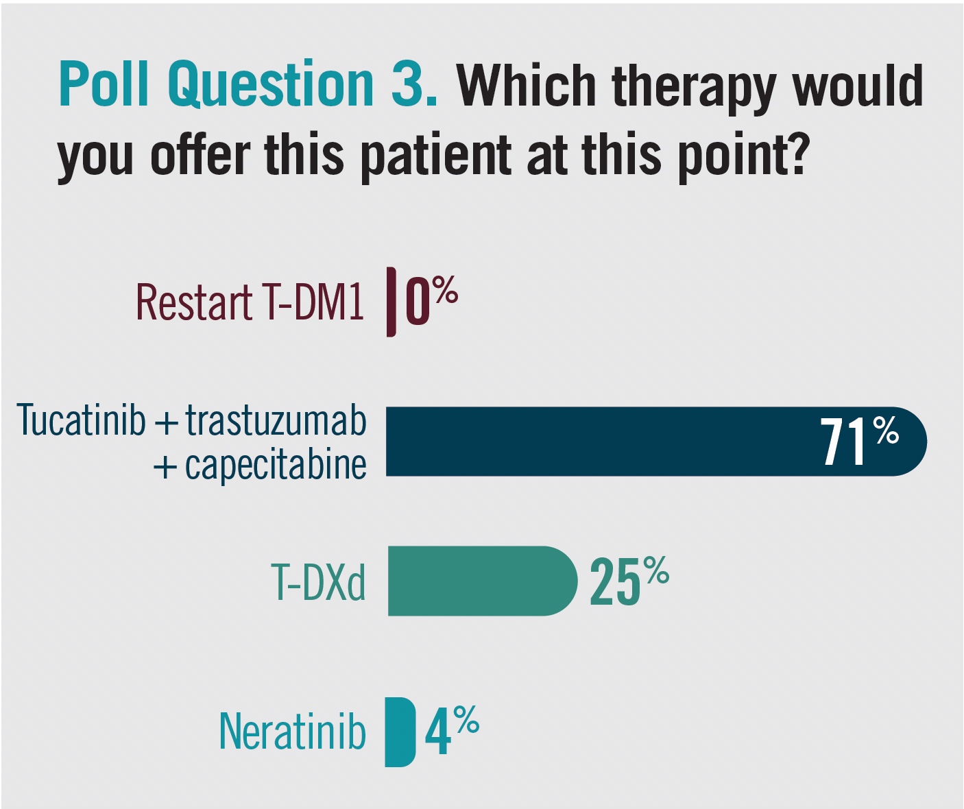 In a polling question, clinicians indicated they would give this patient tucatinib plus trastuzumab plus capecitabine (poll question 3).