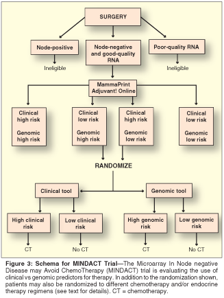 • MINDACT-A separate prospective trial, Microarray In Node negative Disease may Avoid ChemoTherapy (MINDACT), is evaluating the use of MammaPrint for selection of patients to receive chemotherapy (Figure 3).[50] This trial, which is being primarily conducted in Europe, will enroll patients with T1, T2, or operable T3 breast cancer that is lymph node–negative. Prognosis will be assessed with both the 70-gene molecular signature (genomic) and with Adjuvant! Online (clinical).