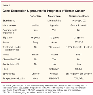 Also, the authors did not personally perform the assays as originally described for each signature (using the various DNA microarray platforms or Oncotype DX assay), but rather, used previously obtained microarray data for evaluation of the signatures in this comparison. Therefore, although the Netherlands signature and the recurrence score appear to yield similar results in this comparison, it is difficult to draw firm conclusions given the significant limitations of the comparison study design.