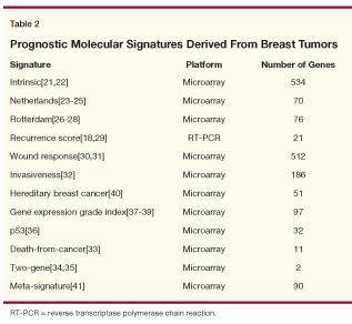 Numerous other molecular signatures have been identified to date, as listed in Table 2. For example, profiles have been developed based on specific aspects of tumor biology, such as p53 mutations (p53 profile) and tumor grade (gene-expression grade index).[36-38] Another signature focuses on the role of fibroblasts in wound healing (wound response).[30,31] While these signatures are of interest, their clinical utility remains to be elucidated.